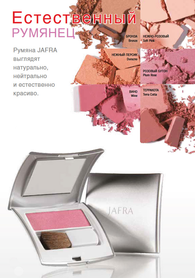 • Румяна выглядят естественно благодаря микросоставляющим ингредиентам, дающим мягкое свечение. Не остаются на поверхности кожи, а впитываются в кожу, усиливая ее естественный цвет.